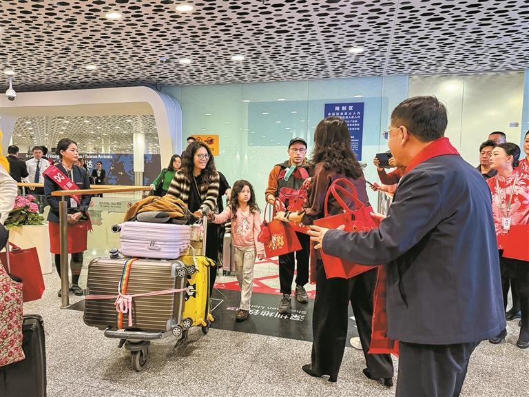 一位英国旅客接过礼包,惊喜地翻开图册,“景区免费、免税店优惠,还有这张AI城市旅行卡——深圳的见面礼太周到了!”他高兴地说,“这个礼包很实用,让我们清楚可以去哪里游玩。”
