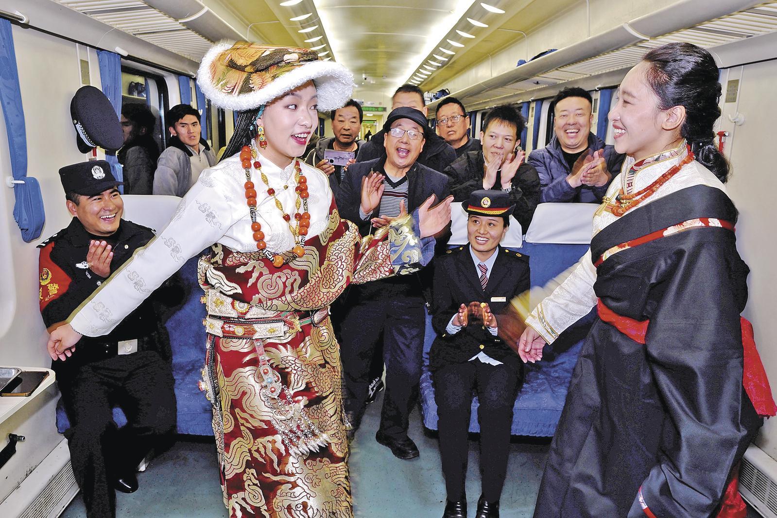 Z22次列车上,身着藏装的姑娘们翩翩起舞。